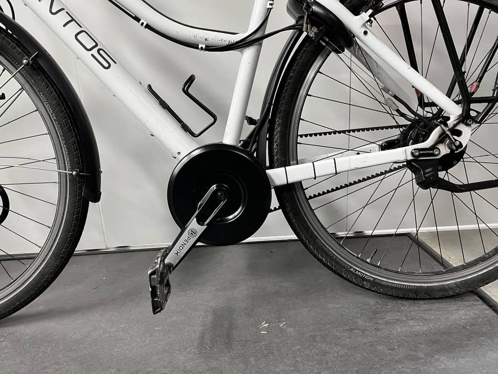 Om de Pendix eDrive te kunnen monteren op de Santos Travel Lite dames is de trapas gedemonteerd. Het originele tandwiel is overgezet op de nieuwe Pendix crank. De Pendix trapas is een elektronische trapas met een geïntegreerde trapkracht sensor. Deze trapas is zorgvuldig in de bottom bracket geplaatst en met afstandsringen is de trapas op de juiste breedte gebracht. Ook is de aandrijflijn van de randriem weer netjes uitgelijnd. Nadat de trapas met een momentsleutel is vastgezet, is de Pendix direct drive motor op de nieuwe trapas gezet. Aangezien deze Travel Lite dames niet voldoende ruimte heeft om de accu op de schuine frame buis te plaatsen om dat daarmee de instap te klein wordt, hebben we de accuhouder wordt gemonteerd achterop de originele bagagedrager. Na montage van de snelheidssensor wordt de trapkracht sensor gekalibreerd en is de e-bike klaar voor vele geluidloze kilometers.
